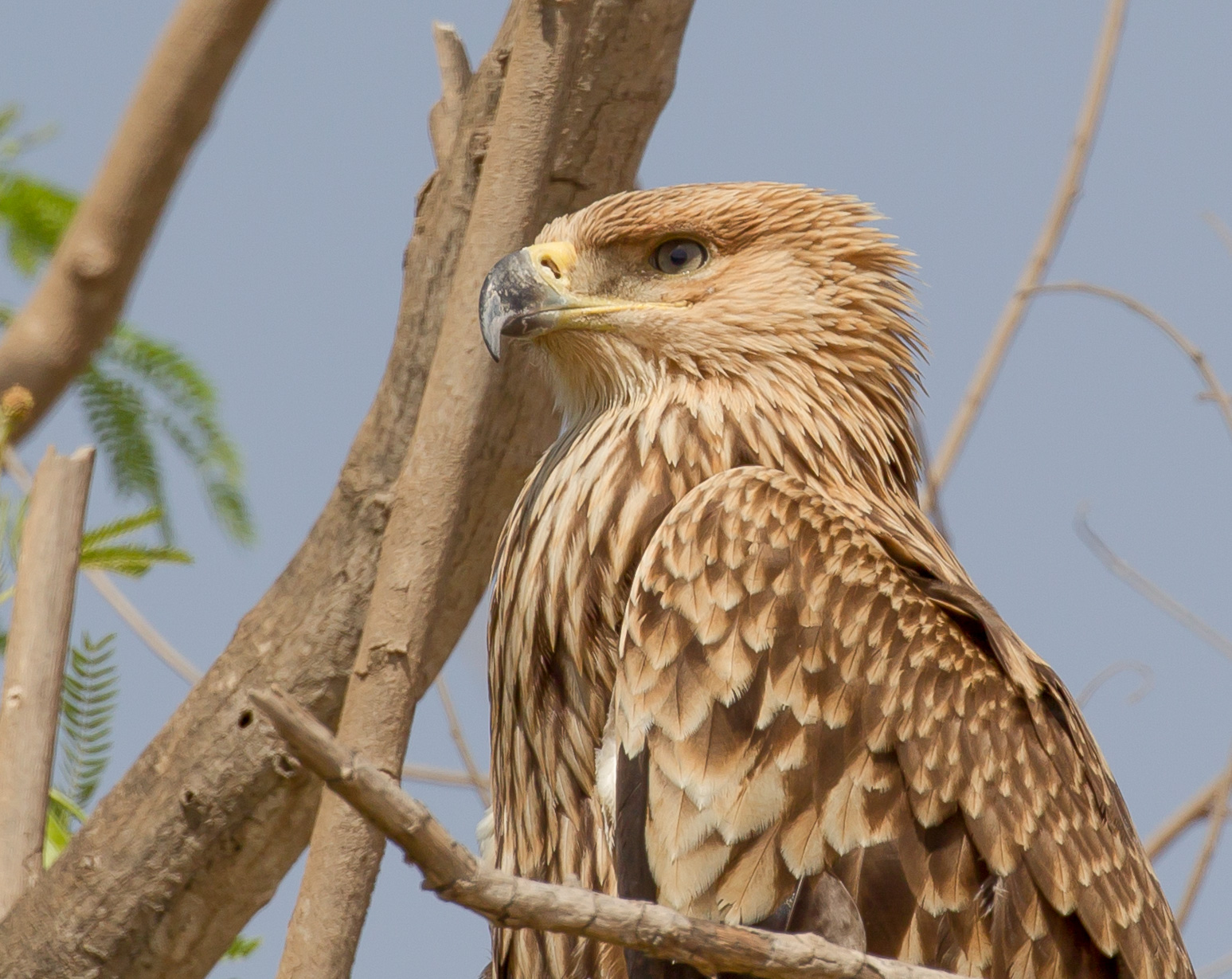Next door to Raysut tip is a water-settling plant. Before going in we saw a few eagles perched up in trees alongside a track next to the water plant. We drove slowly along the track and our attention was drawn to a large pale eagle, clearly no Steppe Eagle. It was a juvenile Eastern Imperial Eagle and obviously did not associate cars with humans. From our vehicle we were allowed a fabulous close approach and we experienced incredible views: